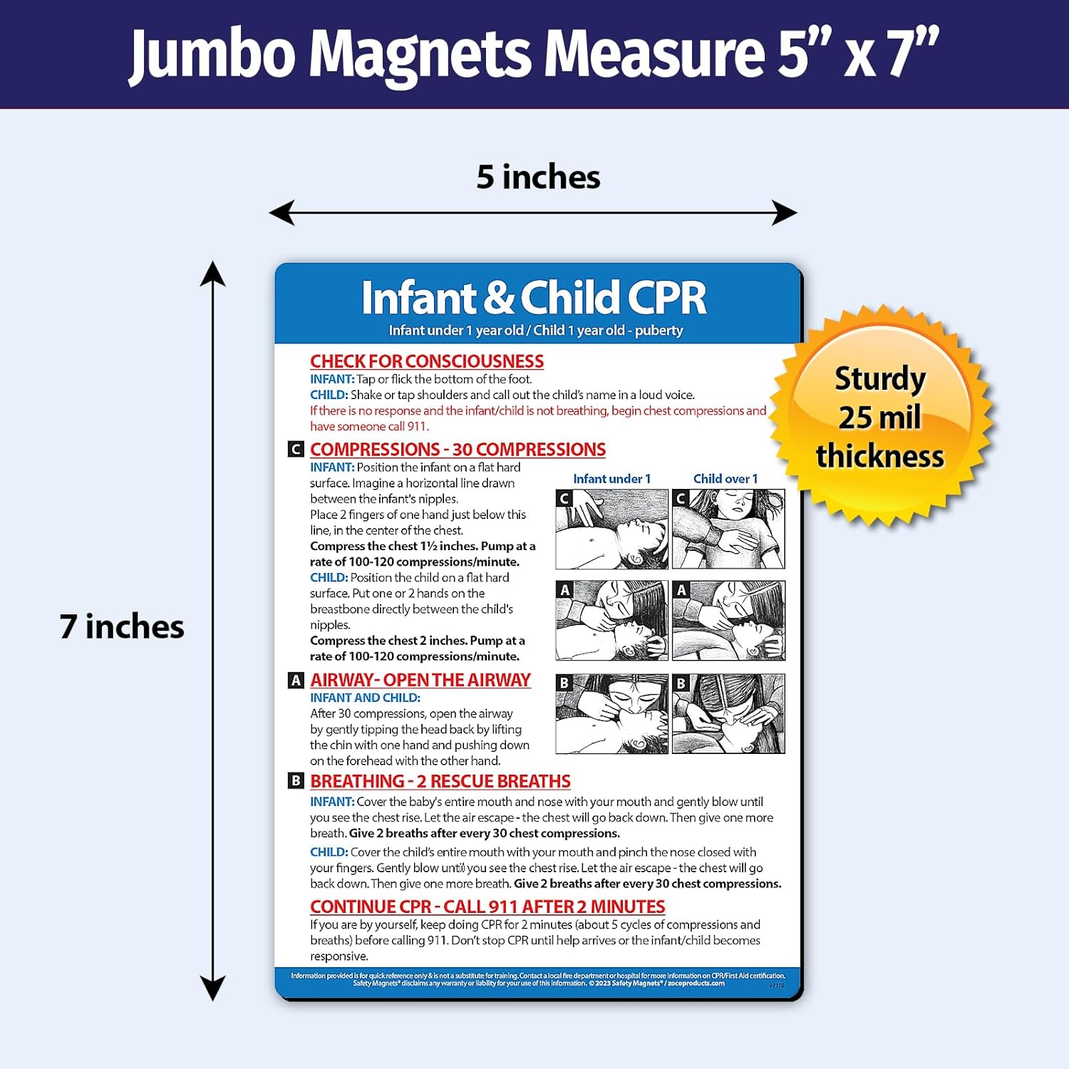 Safety Magnets by ZOCO – Infant and Child CPR Magnet (2-Pack) – 5"x7" Emergency First Aid Guide with Step-by-Step Instructions – CPR Reference for Homes, Daycares, Schools, and Parents