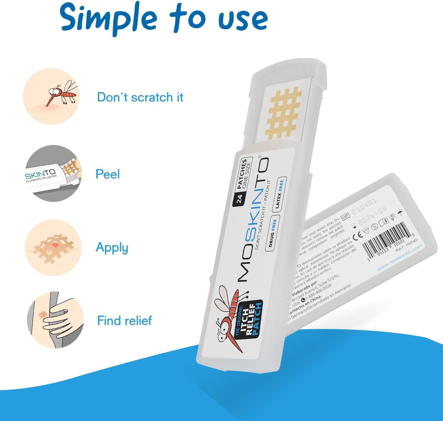 - Convenient Travel Pack: This Moskintoโs insect bites itch relief pack contains 24 nude-colored patches, ideal for easy storage in pockets and bags so you can take them wherever you go; Whether you're a parent, outdoor enthusiast, or someone prone to insect bites, Moskinto is your go-to for an itch-free lifestyle