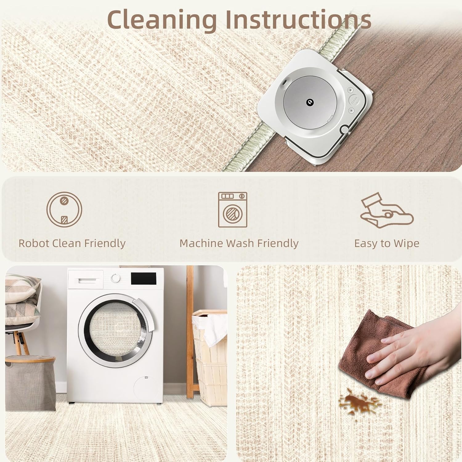- Machine Washable Rug: Our washable rug 6x9 has stain and splash-resistant properties. Use a broom or vacuum cleaner to Clean up or hair for daily care. The rug can be washed directly in the washing machine in cold water, making cleaning a breeze.(Please remember not to use bleach!)