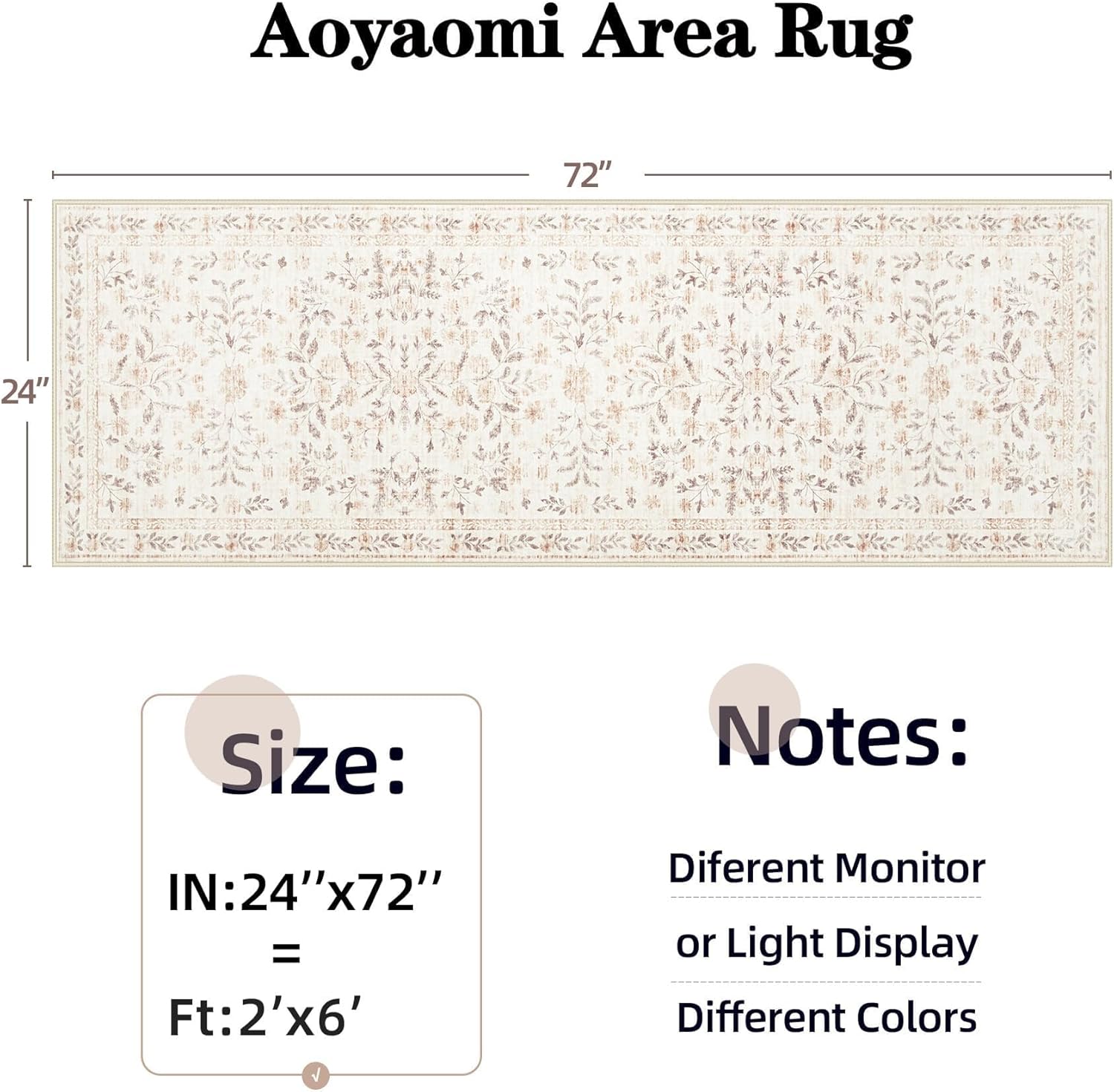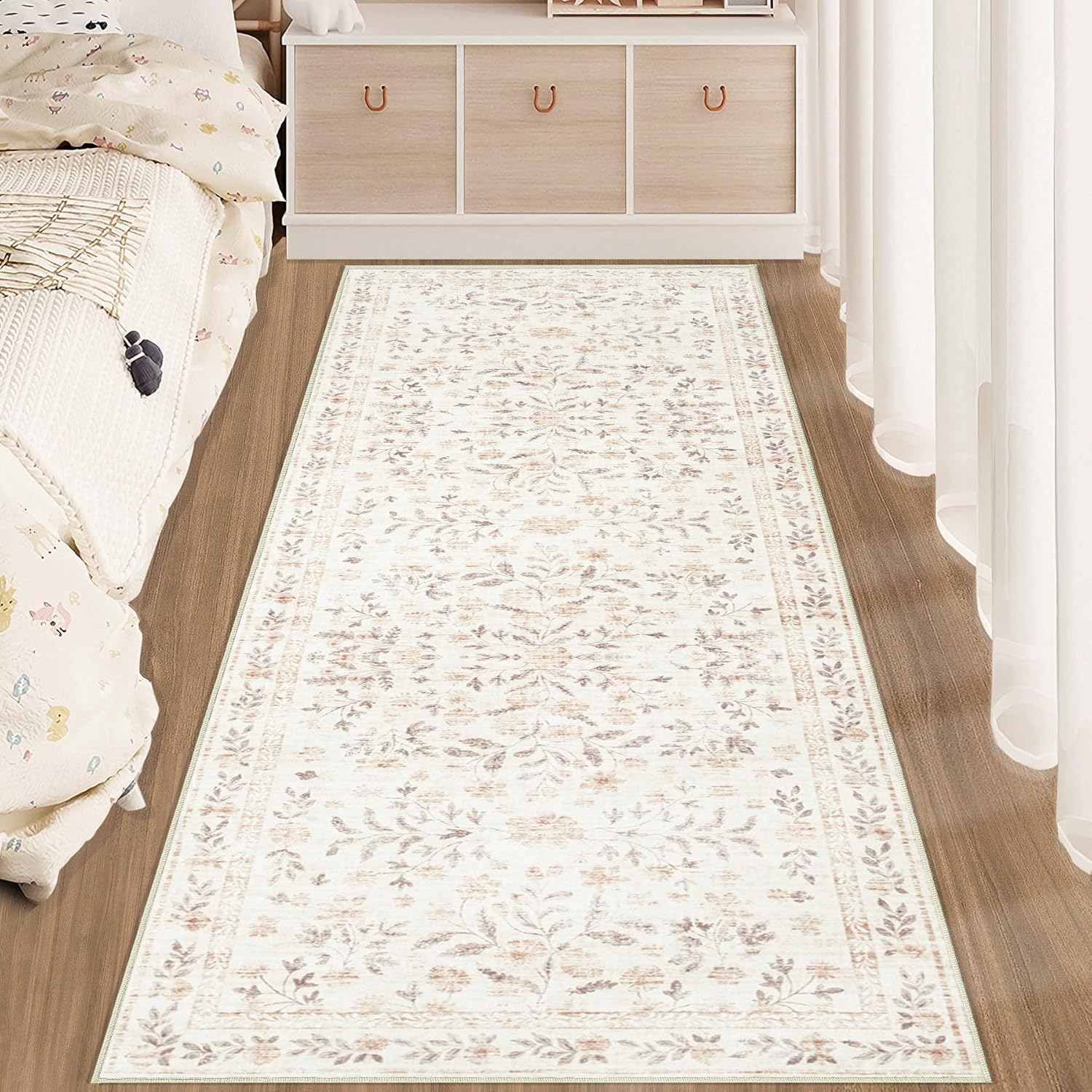 Runner Rug for Hallways 2x6, Washable Boho Runner Rug Non-Slip Kitchen Runner, Soft Low Pile Floral Carpet Runners for Hallway, Bedroom, Bathroom, Laundry, Staircase, Foyer(2'x6', Floral Beige)