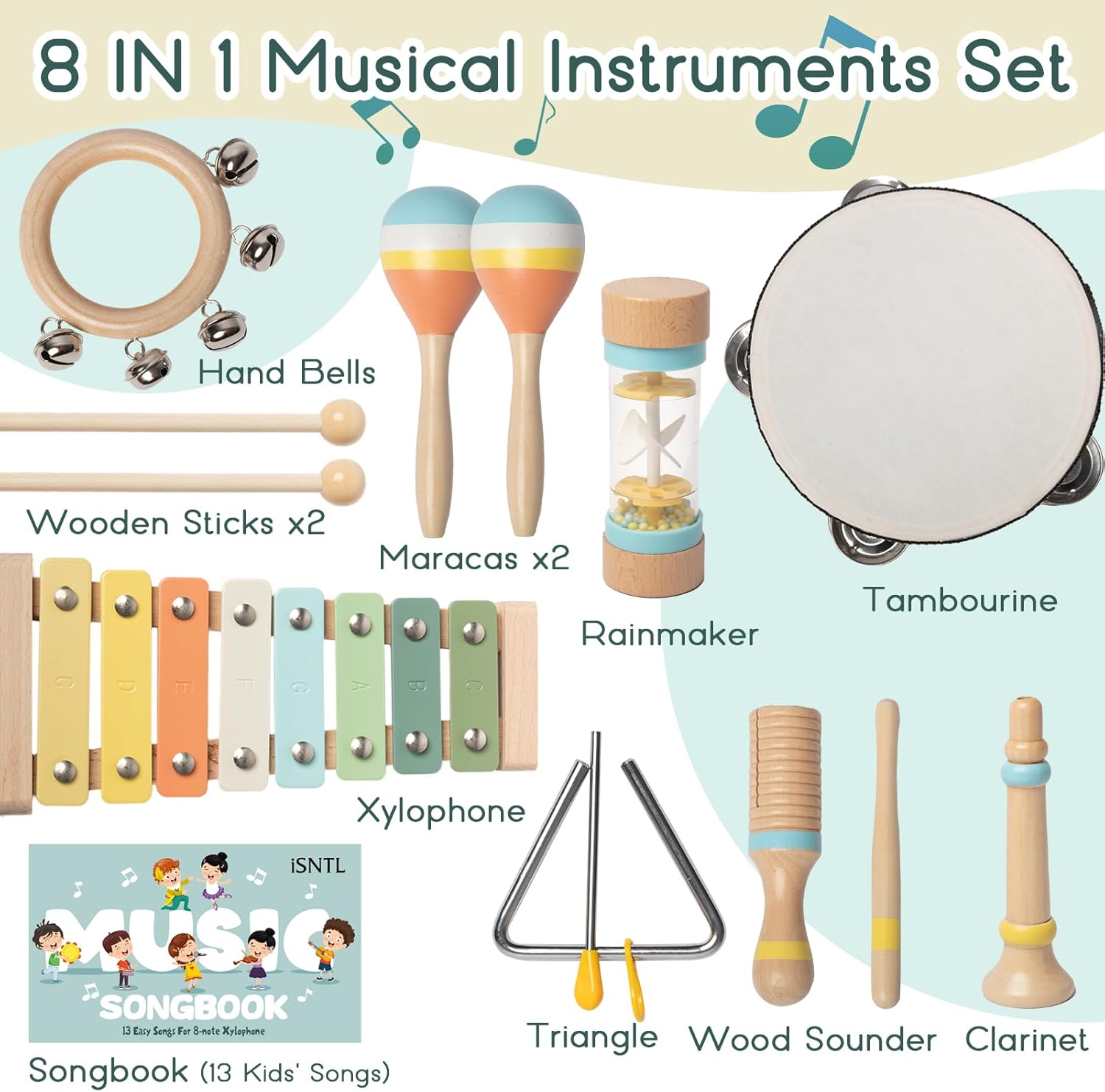 - Wooden Instruments Playset:Our toddlers musical instruments set is designed to cultivate your child's love for music! This toddler music toy set includes an early musical education songbook with 13 kids' songs, 8-tone xylophone with mallets, a tambourine with cymbals, two maracas, a trumpet, a triangle with striker, a wood sounder, a hand bells, and a rainmaker, inviting your little maestro to explore a world of sounds.This is the perfect set of musical instruments for toddlers